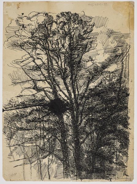 Here is the story: Christian Kongstad Petersen made this drawing called "Trees," with ink on paper. The composition is a dense array of vertical lines that establish the trunks of the trees, contrasting with the foliage in the upper portion of the artwork, which is a flurry of short strokes. This opposition between the vertical and more textured patterns creates visual interest while destabilizing the distinction between depth and surface. Consider the semiotic implications of the marks themselves: each stroke is a signifier, pointing to a network of natural forms and artistic gestures. The act of drawing becomes a symbolic construction of the landscape. The use of hatching to build up the volume of the leaves suggests a concern for form over the accurate depiction of light and shadow. Ultimately, the drawing is less about representing the specific qualities of a landscape, and more about exploring the potential of line and pattern. The artwork invites us to see nature as an assembly of marks, and the artistic practice as an interpretive act.