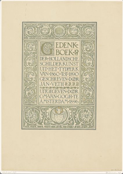Editor: This is "Reyzangen uit Gysbreght van Aemstel door A. Diepenbrock" by Antoon Derkinderen, created between 1894 and 1901, incorporating drawing, typography, and printmaking techniques. The color palette is incredibly muted, but there's such ornate detail within this decorative frame. How would you begin to unpack this piece? Curator: I begin by looking at the visual structure. Note the symmetry: the figures at the top are presented within individual rectangular frames and placed above meticulously typeset text, all contained within a larger, embellished border. Do you see how the artist uses line weight to differentiate the importance of each element? Editor: Yes, the text "Reyzangen uit Gysbreght van Aemstel door A. Diepenbrock" really pops forward because the font appears bolder. What about the figures at the top? Do they interact with the text in any way? Curator: Observe their idealized forms. They appear stoic and detached, almost as if they exist outside of the temporal constraints of the text. Are you seeing how the artist is attempting to unify the visual and the textual elements through compositional balance? Editor: I think so! So the artist seems to balance visual and textual elements and that gives them a sense of unity and harmony. It’s about how it looks and feels together, more than any overt storytelling. I suppose the arrangement creates a hierarchy? Curator: Precisely. Notice the considered use of space, color and shape creating depth of meaning which invites extended contemplation of intrinsic beauty. Editor: It’s interesting how focusing on these basic elements opens up new pathways for understanding the artwork, rather than focusing only on narrative. Curator: Indeed. By looking intently and objectively, the material and aesthetic truths embedded within this visual system come to the foreground.