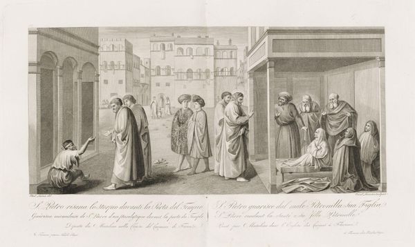 Editor: This engraving by Conte Carlo Lasinio depicts "The Meeting of Saint Joachim and Saint Anne at the Golden Gate" and "The Birth of the Virgin." The composition is split into two scenes, and I'm curious about the division. How does this structure impact the narrative being presented? Curator: It's fascinating how Lasinio uses this diptych format. The composition reflects the prevailing religious and social structures of the time. By juxtaposing the reunion of Joachim and Anne with the birth, what commentary might Lasinio be making about the church's influence on family and lineage? Editor: That's interesting. It makes me think about the public and private spheres of life. Curator: Exactly! It prompts us to consider how such imagery reinforced societal expectations and power dynamics within the church itself. What did you take away from this piece? Editor: I see the artwork as a reflection of the historical context in which it was created.