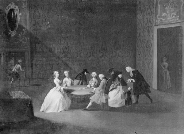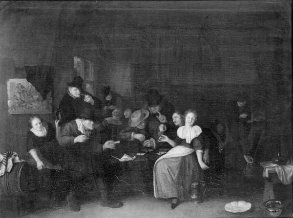 Editor: We're looking at "The Family Having Lunch" painted in 1702 by Gerrit Lundens. It’s an oil on canvas and strikes me as quite a formal snapshot of domestic life, even though it looks like a casual lunch setting. What aspects of the painting stand out to you? Curator: The stark monochrome allows us to really focus on the textures and the material conditions represented here. Look closely at the tiled floor and how its pattern dictates the perspective. The very making of this painting - the grinding of pigments, the weave of the canvas - those elements tell a story of labour and social status. Editor: So, you’re less interested in the family depicted, and more about what the physical creation says about the artist and his context? Curator: Precisely. The act of painting, the choice of canvas, the limited palette; it’s a calculated display of wealth and restraint. Think about the commissioning of such a piece – what kind of client would select an artist, like Lundens, who favors a technique that recalls earlier, perhaps even antiquated, Dutch Golden Age styles, consciously engaging the materials and methods of the past? How is this process tied into how wealthy families wished to represent themselves and their position within a society that had become increasingly stratified? Editor: It’s interesting to think about this as a carefully constructed material object, not just a charming scene of family life. Is the artist drawing on material techniques and themes for any reason, in your opinion? Curator: Indeed. Consider the way the painting is rendered in monochrome. What impact might that have in relation to the materiality of photography, and social status at the time of its creation? I wonder, how did Lundens negotiate contemporary tastes with those earlier traditions, specifically, those related to how one produces painting and represents social life? Editor: That changes my perception. I hadn’t thought about the artist’s conscious choice of materials as part of the message. Curator: It is all about revealing those hidden layers! By paying close attention to materiality and process, we are getting beyond just 'what's in the image’ to question who had the power to create and consume such images.
