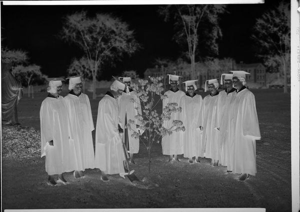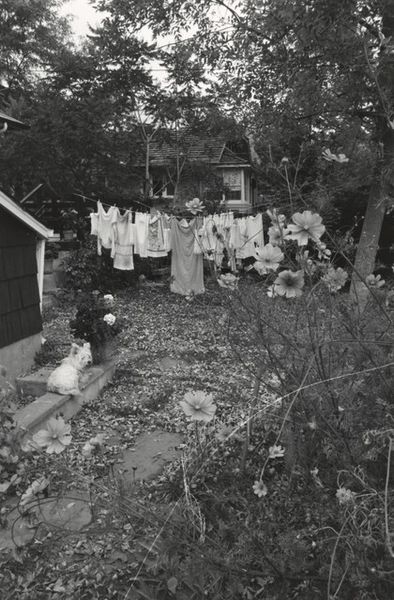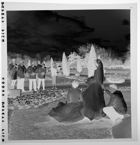 Editor: This silver gelatin print by John Deusing, titled "Untitled (graveside burial, casket below ground)," captures a moment of somber reflection. The stark contrast gives it an eerie, almost dreamlike quality. What's your take on this photograph? Curator: It whispers of rituals, doesn't it? Like a faded memory or a half-remembered dream. The inverted tones transform a familiar scene into something otherworldly. Death is always with us, and Deusing has captured the space between life and what is next. What do you make of that, Editor? Editor: I think that it's a powerful image. Curator: It is that, isn't it? Makes one think about our own mortality, the beauty of fleeting moments, and how art captures it all in a still frame.