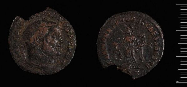 Curator: Here we have a tetradrachm of Alexandria, issued under the rule of Gallienus. Editor: Immediately, I'm struck by the coin's worn surface, yet the relief of the portrait and figure remain quite legible. Curator: Indeed, the portrait is Gallienus himself, radiating authority even through time. On the reverse, we see a figure, likely a representation of a deity, holding what appears to be a scepter or staff. Editor: The figure's stance, combined with the inscription, lends a certain weight to the composition. It's a potent symbol of power and divine right, captured in a small object. Curator: These coins were not merely currency; they were propaganda, reinforcing the emperor's image and legitimacy throughout the empire. Its imagery would have resonated deeply with the people. Editor: It's remarkable how a single object can encapsulate so much history and visual language. Curator: Absolutely, a tiny window into the past.