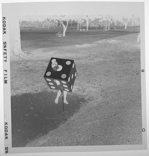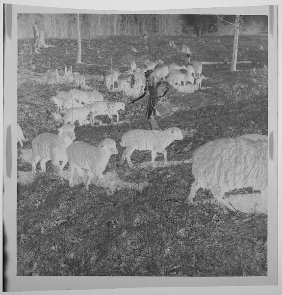 Curator: Jack Gould's compact photograph, which the museum has titled "Untitled (a few sheep wandering around on hillside)", presents a scene of pastoral simplicity. Editor: There’s a certain dreamlike quality to it, isn’t there? The grayscale tones and tight crop give it an intimate, almost melancholic feel. Curator: Indeed, the composition—particularly the stark contrast between the light-drenched sheep and the somber earth—creates a visual tension that speaks to the transient nature of these creatures. Editor: I suppose that looking at this image lets me consider the delicate balance of nature. The artist captured a moment of peaceful coexistence, but it’s also a reminder of our fragile relationship with the land. Curator: That's a lovely reading. Gould’s approach, at least to my eyes, is deeply moving. Editor: Agreed, it is a deceptively simple photograph that resonates long after you’ve turned away.