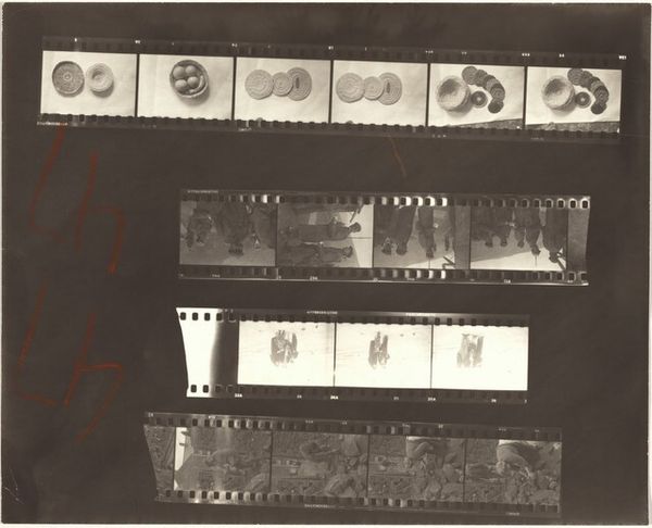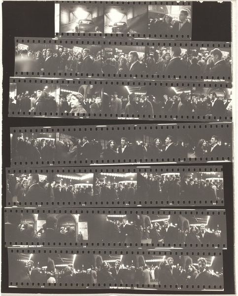 Editor: This is a contact print photograph by Robert Frank, simply titled "Robert Motherwell no number," created in 1962. Seeing all the frames together, a whole roll of film seemingly, I'm struck by its fragmented and intimate quality. It's like we're glimpsing moments of the artist's life in a very raw way. How do you interpret this work? Curator: What stands out to me is the meta-commentary inherent in showing the entire roll. We, as viewers, are invited to witness the photographer's selection process, the choices made, and the outtakes left behind. Consider how the act of framing and presenting images affects their perceived value and meaning. By leaving all images visible, Frank resists the curated image typically put forth by the artist and museum. What implications might that have for photography’s role in documenting truth? Editor: So, it's a statement on how artists, or even historians, shape narratives? By showing everything, Frank removes that filter? Curator: Precisely. We also must remember the socio-political context. In the 1960s, documentary photography and street photography were gaining prominence, challenging traditional forms of portraiture. By refusing to single out the 'perfect' image, he participates in this questioning of authority. Think about the kind of control galleries had on presentation. Editor: That makes me think about the candid quality of the images themselves. They’re less staged, more…human. Curator: Indeed. And that aligns with a broader modernist impulse to dismantle hierarchies, both artistic and social. Does it challenge your understanding of portraiture as a construction? Editor: Absolutely. I initially saw the fragmented nature as just a stylistic choice. Now, it seems crucial to its meaning. I learned a lot today, this isn't a traditional portrait but rather about artistic choices. Thanks! Curator: My pleasure. Understanding the forces shaping how art is presented enriches the experience itself.