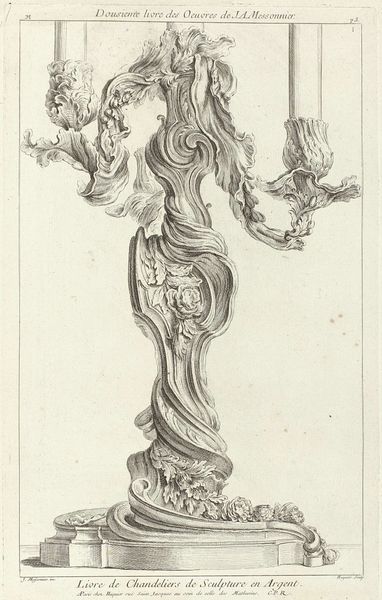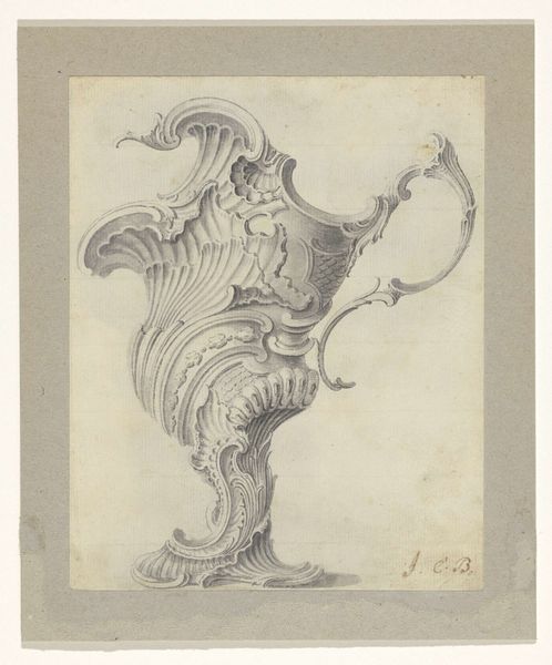 Curator: Here we have a drawing titled "Ontwerp voor de voet van een kandelaar," or "Design for the Foot of a Candlestick," created by Gabriel Huquier sometime between 1738 and 1749. It’s currently held at the Rijksmuseum. Editor: My first thought is how wonderfully impractical it seems! All swirling curves and flourishes. I can already picture the artisans painstakingly shaping metal, likely silver or bronze, into such a complex form. Curator: Indeed. The Baroque style here is quite pronounced. We should consider this drawing not just as a design, but as a document of 18th-century artisanship and consumption. Huquier likely circulated such designs among workshops. How might its ornamental qualities signal status? Editor: That's a compelling point. Think about the social implications of commissioning such elaborate pieces! The labor required, the specialized skills—it screams luxury. But even in a design, the paper quality, the level of detail in the pencil work... these reflect material value, and, subsequently, social currency. Curator: Right. These drawings acted as visual languages for artisans and their patrons. By examining these designs, we see that decorative arts played an active role in affirming power, echoing into architecture and dress of the elites. What impact would that have in wider society? Editor: Possibly even a cultural affirmation. And there's also the function itself: the candlestick. Candles weren’t cheap. Imagine this elaborate foot supporting something both practical and beautiful, casting light into spaces, reinforcing hierarchies, rituals... the power of the decorative object! Curator: So the image invites multiple readings— as an artifact of design and of aspiration, linked to a network of patronage, production, and material desire. That really contextualizes it beyond just a preliminary drawing. Editor: Exactly! Thinking about who owned such candlesticks, and the labor practices employed in making them, reveals layers of social, economic, and cultural information embedded within. I think that’s critical for today’s viewers to see when engaging with this design.