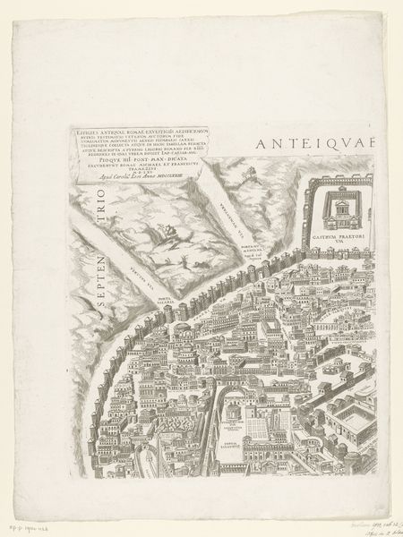 Editor: Here we have “Plattegrond van Rome in de Romeinse tijd (tweede deel)”, or “Map of Rome in Roman times (part two)”, created between 1639 and 1691. It’s an engraving by Étienne Dupérac, housed at the Rijksmuseum. It reminds me of a highly detailed bird's-eye view...almost like an architectural blueprint but for an entire ancient city. What really strikes you about this piece? Curator: It’s so easy to get lost in the delicate lines and imagined perspectives, isn't it? When I look at Dupérac's map, I’m immediately transported – not just to ancient Rome, but also to the *idea* of Rome, heavily influenced by Renaissance ideals. Dupérac wasn’t simply documenting; he was rebuilding a vision, based on scholarship and imagination. Look at the density, almost like a tapestry. What feelings does this create for you? Editor: The density feels…overwhelming. Like trying to understand a history book with too many footnotes. But I also appreciate how it captures the immense scale and complexity of Rome. It wasn't just a city, but a symbol of power and civilization. Curator: Exactly! And it makes you wonder about what he chose to include, and what he didn't, and *why*. Remember, these maps were often political tools, reflecting the aspirations of their patrons as much as the realities of the past. Can you see evidence of this in the presentation of certain buildings or features? Editor: Hmm, perhaps the prominent display of the Colosseum hints at the emphasis on Roman grandeur? This wasn't just a geographical representation, it's a narrative in lines and ink! Curator: Precisely! Dupérac offers us more than just directions. He presents a story. By looking closely, and asking the right questions, we gain insights not only into the artist's techniques but also into the cultural context in which he operated. Editor: I now appreciate how much a map from centuries ago can teach us. Thanks, I’ll definitely see such artworks in a new light from now on!