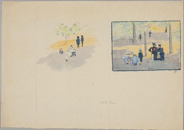 Editor: This is Eugène Louis Gillot's watercolor, "Fete Nautique." It feels…sketchy, almost unfinished, but full of movement. All the people make me wonder about the energy of the event. What do you see in this piece? Curator: It’s like a memory, isn't it? Fleeting and impressionistic. The colors evoke a festive mood, but there’s also a sense of transience. Look at how Gillot suggests the crowd with just a few brushstrokes. What story might those strokes be telling? Editor: Perhaps a story of fleeting joy, a day enjoyed and then gone? Curator: Precisely! The beauty lies in its ephemeral quality, reminding us to seize the moment, wouldn't you agree? Editor: Absolutely. Thanks! I see so much more now.