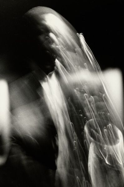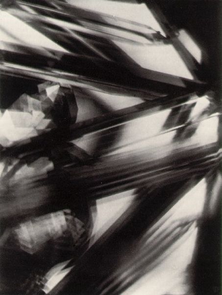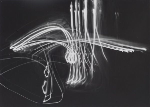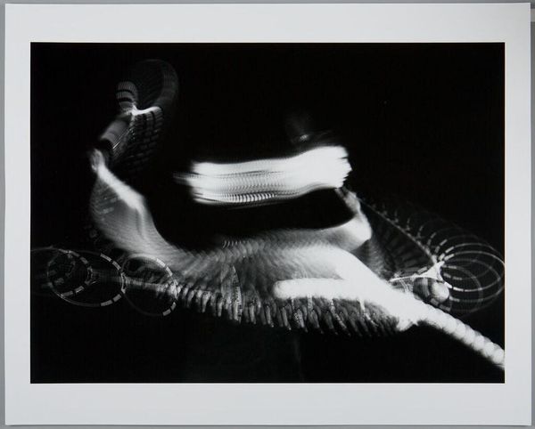 Curator: Let’s turn our attention to Harry Callahan’s photographic work titled "Camera Movement on Automobile Reflection," created between 1945 and 1947. It is quite something, isn't it? Editor: Absolutely. At first glance, it's a whirlwind. It evokes speed, fleeting moments, and almost a sense of disorientation with those radiating blurred forms. Curator: It's a compelling example of Callahan's experiments with movement and abstraction. Callahan was working at a time when abstraction was gaining prominence in art. Think of its potential connection to contemporary concerns of postwar industrial acceleration. What was the social meaning of this technological drive? Editor: That's interesting to consider alongside Callahan's technical innovations. His use of extended exposure to capture the dynamism of a passing automobile reflection transforms the mundane into the spectacular. He challenges our notions of photographic representation. Curator: Precisely. Notice the tonal range. The contrast between stark blacks and ghostly whites creates a visually arresting image. The high contrast underscores the linear, geometric quality, despite the blur. The lines create an ethereal quality but hold the whole structure of the piece together. Editor: From a cultural standpoint, consider the role of the automobile in postwar America: symbol of progress, freedom, and also perhaps alienation as urban spaces transformed around car use. It begs the question of where technology intersects with lived experiences. Callahan captured an aesthetic truth. Curator: He’s definitely exploring a theme that permeates other works during this period: the dynamism of modernity, seen not as an object but felt and experienced through movement. It makes me ponder: what else did Callahan try to capture within that particular period of technological enthusiasm and fear? Editor: Reflecting upon this work leaves me with a lasting impression about our ability to find beauty, and deeper meaning, even within our era’s industrial landscapes. Callahan showed a lot of promise to upcoming street photographers who used elements such as light and shadow, framing and blur to create stunning visuals in urban settings. Curator: Indeed. A reminder that, sometimes, it’s the journey, not the destination, that truly matters.