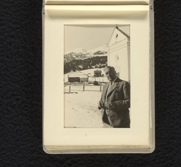 Editor: Here we have a photograph, "Isabel Wachenheimer in de sneeuw voor het huis van de familie Wachenheimer, 1931, M\u00fcnchen," dating from around 1931-1933. It's a charming image, very intimate, like a snapshot from a family album. What symbolic elements strike you, looking at this piece? Curator: The snow itself is incredibly evocative, isn't it? Snow, in visual language, often represents purity, but also isolation, a blanketing or even erasure. In this context, consider the date. This photo exists in the shadow of a looming darkness in Europe, a period where identities and lives were about to be violently disrupted. Is the snow a symbol of the fragility of innocence and childhood against such forces? What do you make of the fact that the building looms so largely in the background? Editor: That's interesting; I hadn't considered that looming aspect. It is a very solid, imposing building, and dwarfs Isabel. Is it possible the home represents safety, given the turmoil? Curator: Precisely! The building could symbolize the permanence and refuge the family home provides. Consider the gaze of the girl, too. Is she confident or apprehensive? It's a tender portrait, and there's an ambiguity there that reflects the uncertain times, creating layers of visual storytelling. What does the format suggest to you? The way it is mounted inside an album page, almost like a pressed flower? Editor: It makes me think of memory, preservation, almost a conscious act of holding onto this moment. This has been a poignant analysis of how simple pictures can be infused with such powerful cultural meaning. Curator: Indeed. By recognizing the symbolism in such a simple image, we gain a richer understanding not just of this particular family but also of the period itself, capturing a life amidst monumental societal change.