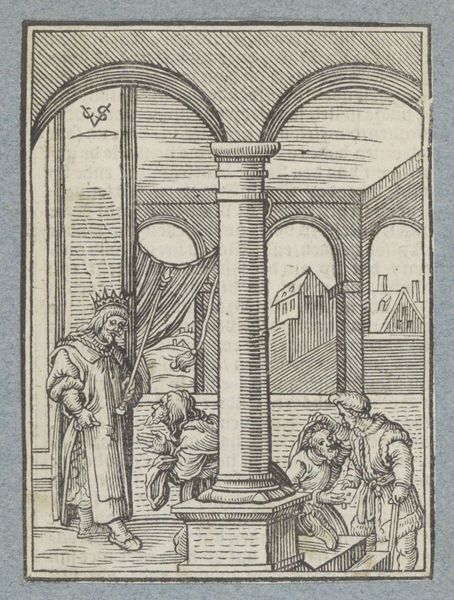 Sebald Beham created this engraving, "Joachim en Anna ontmoeten elkaar bij de poort", in the 16th century, a time when religious art served as a powerful tool for shaping social and moral values. Beham was one of the German Little Masters, known for their small-scale, detailed prints. Here, we see the emotional reunion of Joachim and Anna, the parents of the Virgin Mary, after a long period of separation due to their childlessness. Consider how the embrace, rendered in the intimate scale of the engraving, invites viewers into a personal, almost voyeuristic experience of the sacred. The architecture frames the figures, but it’s their embrace, the converging lines of their bodies, that commands our attention. In a society deeply concerned with lineage and legacy, the narrative of Joachim and Anna offered hope and resilience to those facing similar social stigmas. By focusing on this deeply personal moment, Beham humanizes the divine, making it accessible and profoundly relatable.