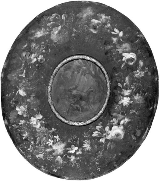 Curator: Well, that’s… unexpected. All those delicate blooms framing a murky interior scene. It feels like I’m peering through a keyhole into a secret garden, one with a rather dramatic backstory. Editor: It's quite intriguing, isn't it? We’re looking at “A Biblical Scene,” a painting done sometime between 1691 and 1727 by Johann Sigismund Ebert. Curator: That circle of flowers really throws me off! They remind me of paper doilies, or even an advertisement, framing something probably way more important to the artist. Makes me think: Why soften the blow of the historical narrative like that? Editor: Given its baroque style, it may play into the allegory as it relates to idealized landscapes—like a Garden of Eden for contemplation, meant to frame moral lessons within visually harmonious forms. Notice how those flowers, which would have held symbolic weight back then, encircle that inner tableau... Curator: Ooh, like beauty cloaking truth, or perhaps deflecting attention from something the eye might not be ready to see straight away. Is that even a battle I glimpse there in the centre, some kind of ancient clash being prettified? Editor: Quite possibly! Those clashing figures and dense forests represent something powerful. History paintings back then often did. What emotional weight is added when placed within such fragile transience as blooming flowers, I wonder? Curator: It almost feels sacrilegious, blending high drama and decoration in such a nonchalant way. Baroque! It's a visual argument for layers, for complexities... for not taking things at face value! Is there some emotional layering going on? Editor: Indeed, that layering offers insight into the values of that time and continues to resonate through symbols that carry cultural and emotional understanding even today. Curator: I hadn't expected to find this kind of…tension in it when I first saw this piece, but it kind of thrills me that a gentle arrangement can conceal something fierce. Editor: Precisely! The charm pulls you in to see, the hidden center demands reflection.