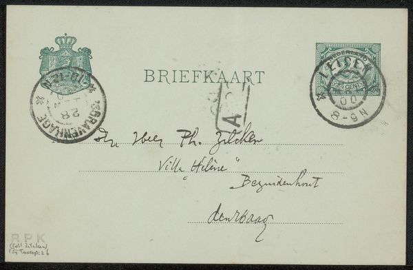 This is an undated briefkaart, or postcard, made by Jan Toorop and sent to Philip Zilcken, and it now resides in the Rijksmuseum. What might a seemingly simple piece of mail tell us about the society and art world of its time? The design incorporates official imagery, like the Dutch coat of arms and postage stamp, reflecting the role of the postal service in connecting individuals within the nation. The handwritten address indicates a personal connection between Toorop and Zilcken, likely within artistic circles of the Hague, given the address it was sent to. To fully understand this postcard, we would need to delve into archival research, exploring the correspondence and networks of artists like Toorop. What was the nature of his relationship with Zilcken? What role did postcards play in their artistic exchange? Examining these questions reveals how art and communication intertwined within a specific cultural and institutional context.