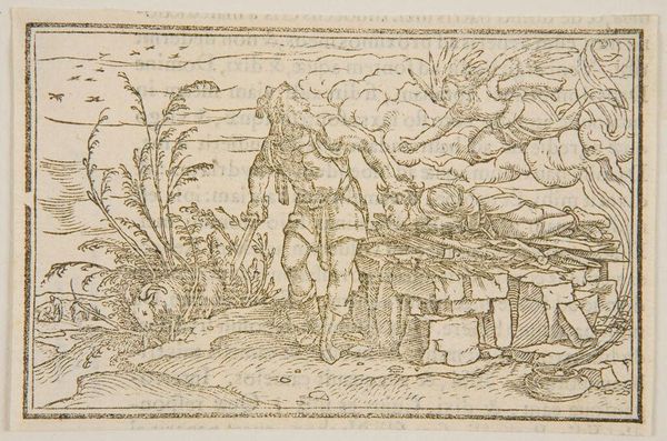 Curator: This is an intriguing print titled "Cut I" by an anonymous artist, held here at the Harvard Art Museums. It's small but dense with imagery. Editor: Initially, it strikes me as wonderfully apocalyptic—the heavy rain, the teeming crowd. There's an intensity of line and texture. Curator: It feels medieval, doesn't it? The way the figures are drawn, almost like characters in a morality play. I wonder about that figure ascending to the heavens. Editor: Right. It reminds me of the precarity of everyday existence during that period, the ever-present threat of famine, disease, social upheaval. Curator: Yes, and the promise, or threat, of divine intervention. Though the artist is unknown, the image holds such power. Editor: Power, indeed. It serves as a stark reminder of the social anxieties that permeated society. Curator: It speaks to the timelessness of human struggle and aspiration. Editor: Absolutely—a reminder that even in the face of uncertainty, humanity endures, questions, and creates.