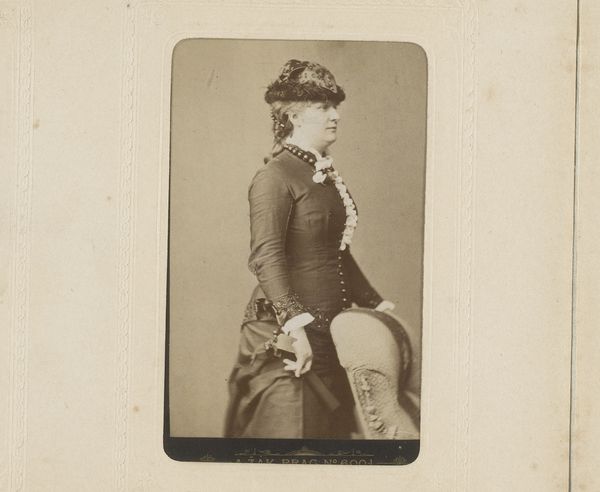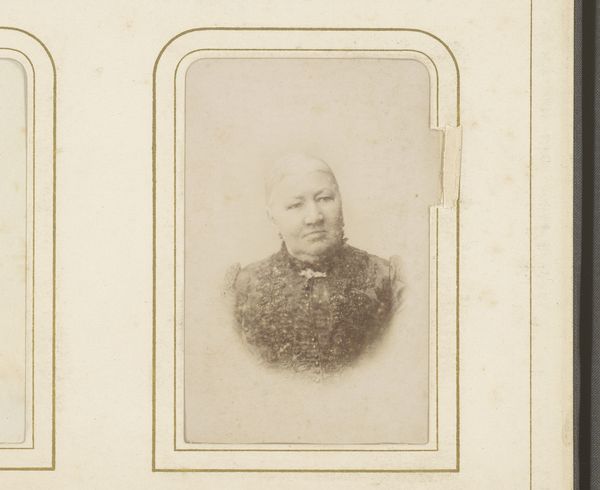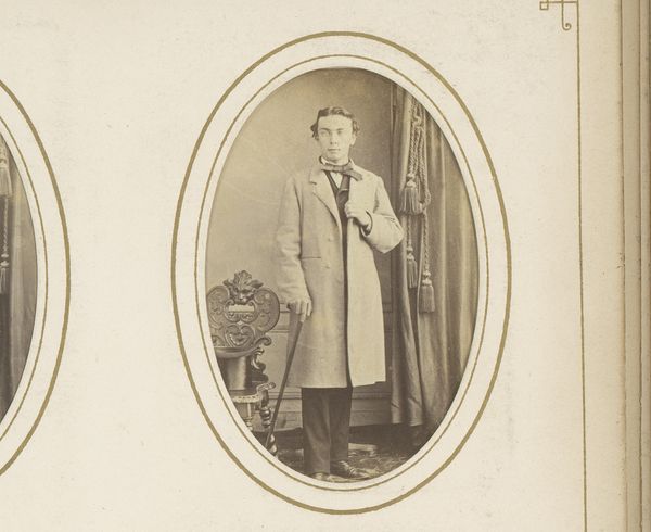 Editor: So, this is “Portret van een man,” taken sometime between 1865 and 1885, created by Wilhelm J. Grammann using the albumen print process. I find the monochromatic sepia tones and oval framing to be quite striking; it makes it seem as though we are peering into the past. How do you interpret this work, focusing on its visual properties? Curator: Note the calculated distribution of light. The man, supported by the pillar, appears firmly situated within the visual plane; the column becomes the physical means to accomplish the unity of the elements depicted, no more or less. Are you interested in what creates the formal tension within the frame? Editor: I am intrigued by this "tension." Could you elaborate? Curator: Observe the framing and consider the spatial arrangements, what purpose does the oval within a square format fulfill? The geometric construction invites contemplation and dictates the viewer’s gaze towards specific elements. How do you believe the texture of the coat complements or contrasts with the smooth surface of the pillar? Editor: I see! The textured coat introduces a tactile element which prevents our gaze from wandering along only straight, uniform lines, the eye now wanders over undulations as much as directions. So you believe the tension you describe is deliberate and contributes to the work as a whole? Curator: Precisely! It isn’t mere coincidence; such careful juxtaposition enhances visual intrigue. It invites one to contemplate material, tone, line. An approach through these methods creates more space for inquiry, wouldn’t you agree? Editor: Yes, I definitely see the merit in observing how forms create different meanings and, indeed, direct one's sightline. It’s fascinating to consider the internal logic of an artwork.