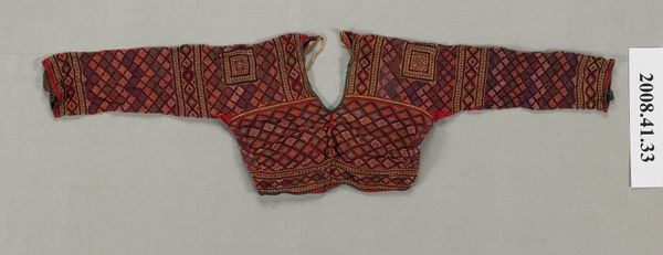 Curator: What a fantastic piece! We’re looking at a Ceremonial Blouse from the Bagobo tribe. Its date of creation is, unfortunately, unknown, but it resides here at the Minneapolis Institute of Art. Editor: Immediately, I get a sense of… ceremony. It’s intricate but in a grounded way, not precious. A story waiting to be worn, wouldn't you say? Curator: Precisely! These blouses were often significant markers of status and community identity. We're looking at cotton primarily, I believe. Notice the hand-embroidered elements, and beadwork. Editor: The pattern repetition is almost hypnotic, a rhythmic visual language. Like a mantra or the beating of drums at the ceremony. It is fashion as a sacred expression, yes? I am curious about these shapes – two stick figures making up the side figures. Curator: Absolutely, the motifs may represent ancestral figures or specific societal roles. It reflects both social hierarchies and ritual practices through iconography, the regular patterns possibly symbolizing social stability. It’s likely it has a rich, meaningful visual vocabulary we no longer completely understand. Editor: Imagine the countless hours spent creating it. There is something potent in textiles, isn't there? They become a map of cultural memory, and collective labor. To imagine that all those tiny beads, the precision… It speaks of devotion. What did these garments signify, I wonder? What sort of event called it to life? Curator: Likely important community events, celebrations of harvest, perhaps even rites of passage. Textiles within indigenous cultures frequently carry legal and spiritual significance, legitimizing hierarchies, codifying traditions. Its existence as art in our collection allows reflection upon our interpretations against its place of origin. Editor: Well, I am pleased we were given this opportunity to celebrate these works in a new light! A fascinating glimpse into lived, storied culture. Curator: A vital perspective, helping bridge divides and broadening understandings of artistry in all its forms.