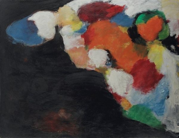 Curator: We’re standing now before Sadamasa Motonaga's "Work," painted in 1964. He worked primarily with acrylic paint on canvas. Editor: Immediately, I'm struck by how these vibrant colors are allowed to bleed and blend, yet still hold their distinct shapes. It's like witnessing controlled chaos. Curator: Yes, and that "controlled chaos" is so characteristic of the Gutai movement. Motonaga, along with other Gutai artists, were rebelling against traditional art forms in post-war Japan. It was a time of intense social change, and art became a vehicle for expressing freedom and challenging established norms. Editor: The way the acrylic paint is applied seems crucial. He isn't brushing it so much as pouring it. The forms remind me of surrealist automatism. Curator: Absolutely. Gutai artists frequently explored new materials and techniques to liberate the art-making process, emphasizing gesture and materiality. They questioned the traditional role of the artist as the sole creator, opening art to chance and accident. "Work," specifically, exemplifies Gutai’s move to physical engagement within art. Editor: There is an almost playful interaction of shapes here. I see no brushstrokes, just these organically pooling forms in primary colors. It's visually engaging, a push-and-pull of figure and ground relationships, despite the seemingly simple composition. It's bold, declarative even. Curator: Motonaga’s work resonated deeply during a time when artists aimed to create new visual vocabularies reflective of cultural upheaval. The Gutai group showed that art wasn’t just something made *by* an artist, but an event co-created *with* material. Museums displayed this spirit prominently, highlighting art as a place where materials revealed and played out transformative effects. Editor: Looking at this, I am captivated by this raw energy of its form and vibrant color palette. It is less about representation, and more a celebration of color itself. Curator: For me, it’s how Motonaga’s piece represents art's role to serve cultural needs by using abstraction and action to move past historical constraints. It invites all of us to witness art that pushes against boundaries.