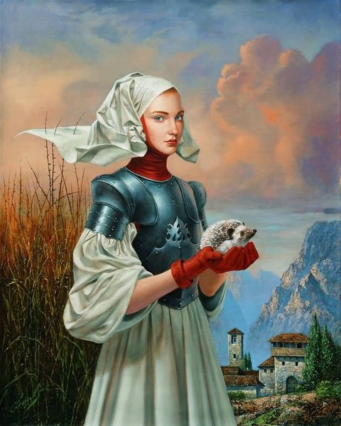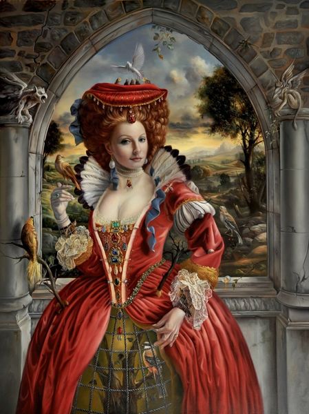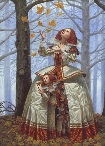 Michael Cheval made this painting, Royal Trap, using oil on canvas. The level of detail is striking, almost surreal. Just look at the way he's rendered the textures – the sheen of her blue dress, the crispness of her lace collar, and that metallic headpiece, which, by the way, is such a funny and weird detail, isn't it? The way the paint is applied, thin and smooth, really lets the colors sing, especially that intense blue against the warm oranges and browns of the autumnal setting. It’s like a classical portrait gone haywire, the kind of thing you might see in a dream, or maybe a slightly disturbing fairytale. There's something about the way Cheval combines technical skill with a quirky imagination that reminds me a bit of Magritte. But where Magritte is cool and detached, Cheval feels more theatrical and emotional. Both artists ask us to question what we see, though, and that's always a good thing.