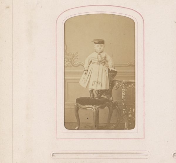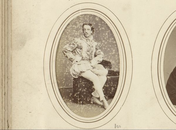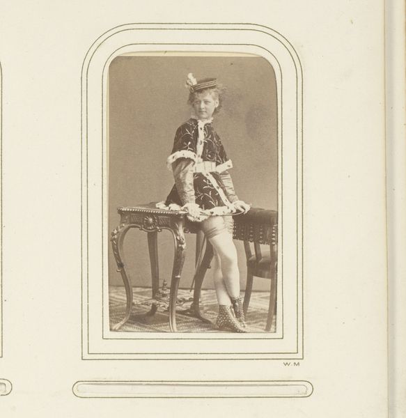 Editor: This is a gelatin-silver print titled "Portret van Josephine Durwend, ook bekend als Finette," created by Disdéri & Co. between 1860 and 1880. I'm struck by its antique appearance, a snapshot from a bygone era. The subject’s pose, so deliberately nonchalant, catches my attention. What stories do you think this image is trying to tell? Curator: The "nonchalant" pose itself speaks volumes, doesn't it? It’s theatrical, almost performative, yet carefully controlled within the conventions of portraiture. Look closely: how does the soft focus, typical of early photography, affect our perception of Finette’s character? Are we meant to see a person, or an archetype? Editor: Archetype…that's interesting! So you see it as more symbolic than a straightforward depiction of an individual? Curator: Indeed. Photography in this period was still wrestling with its identity as art versus documentation. This portrait plays with that tension. Consider her costume-like dress and dramatic background. Don't they whisper of the stage, of roles played? Perhaps the image explores how identity itself can be constructed, costumed, and performed for an audience. This photograph freezes not just a likeness, but an *idea* of a person. Editor: So it's not just about who she *was*, but who she wanted to be, or who the photographer wanted her to be? Almost a collaboration in crafting an image? Curator: Precisely! It prompts us to consider the cultural memory embedded in visual symbols. Finette’s self-presentation, filtered through the photographer’s lens and the era's ideals, reflects shared understandings of femininity, status, and even desire. Think of the psychology at play— projecting an image into the world with intention. What lasting effect does that projected persona have on us? Editor: That gives me a whole new perspective on the image! Thanks, that really illuminates so much more than just an old photograph. Curator: It's these layers of symbolism that keep these old photographs alive, prompting us to examine ourselves and our cultural narratives.