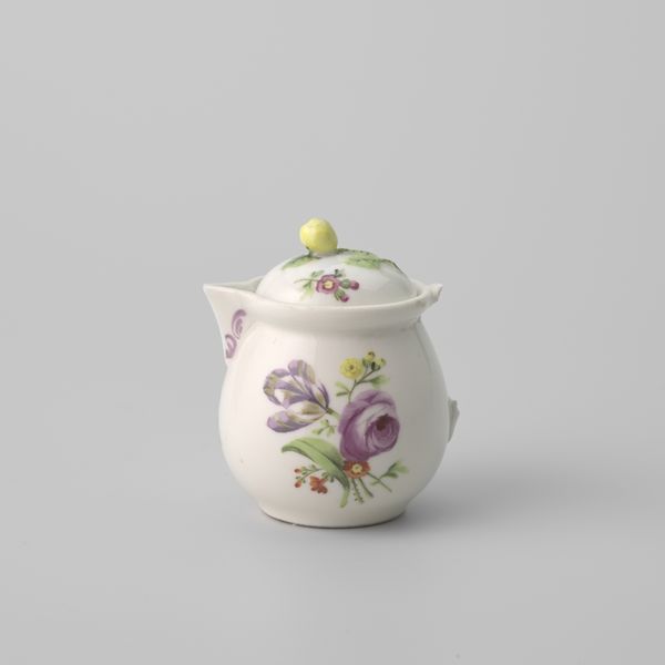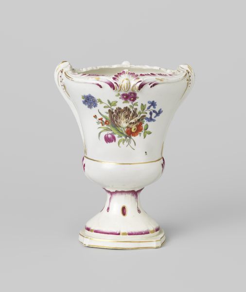 Curator: Here we have a porcelain vase, delicately rendered with tempera paint. This piece, attributed to Loosdrecht, dates back to around 1778-1782. You’ll notice its Rococo flourishes, particularly in the floral arrangements and the gilded ram's head handles. Editor: Oh, it’s lovely, almost absurdly so! It looks like something Marie Antoinette would have kept on her bedside table. It has a dreamy quality, and it feels so delicate it could shatter if I breathed on it wrong! Curator: Indeed! These so-called decorative arts served a distinct social function. They were markers of class, taste, and worldliness. Beyond its aesthetic appeal, consider this piece within the political landscape of the Dutch Republic, reflecting its colonial engagements and elite culture. Editor: Rams’ heads next to pretty bouquets? That contrast is wild! It’s like the vase is wrestling with its own identity: refined decoration versus raw, animalistic energy. Perhaps it says something about how the upper class liked to think of themselves: both civilized and virile. Curator: Precisely! Gender is a crucial entry point. The flowers are decidedly feminine, while the rams, symbolically powerful, hint at a masculine presence. This interplay complicates readings of Dutch identity at the time, reflecting both the patriarchal norms and performative decadence of its elite. Editor: Now I’m wondering, who arranged the flowers so carefully? The flowers feel vibrant. Maybe there is something revolutionary in preserving the bright of these flowers, an embrace of something lively and irrepressible in the face of society? Curator: That's an insightful thought, because in a way, that preservation hints at anxieties around ephemerality. This vase, as an object, also carries meanings related to its Dutch origins, and, if we explore it, could prompt important questions about trade and ethics. Editor: The more you speak, the more the ram’s heads bother me! I think I want to repaint the vase—cover those heads with more flowers. The delicacy has me hooked and yet… that starkness grates on me in this setting! It certainly offers an invitation to reinterpret the Dutch image. Curator: It’s those tensions and layers that continue to engage me! These objects, far from simple decorations, embody complex social negotiations, power dynamics, and identity politics that still echo today.