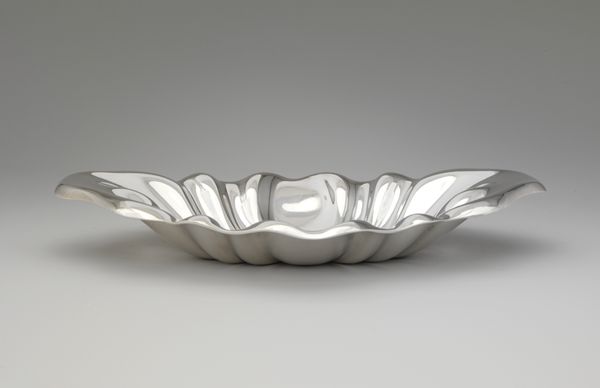 Curator: I find myself quite drawn to the subtle elegance of this piece. Its cool gray surface suggests a restrained sophistication. Editor: This is the "Presenteerschaal van tin," or Presentation Scale made of tin, crafted by Orivit around 1910. It exemplifies the Art Nouveau style in decorative art and sculpture. Right away I see the craftsmanship that speaks to me – the way the metal has been shaped. It almost invites touch. Curator: Yes, observe how the fluid lines and stylized organic motifs, like the abstracted floral forms at its corners, create a dynamic interplay of positive and negative space. The overall form undulates. A masterful exploration of visual rhythm and compositional balance. Editor: And thinking of Orivit, their specialization in metalwork reveals a focus on the properties of tin itself. They’re elevating a base material through skilled labor, blurring the lines between mass production and unique artwork by giving value to its fabrication and challenging the classical materials that people considered “art”. Curator: Precisely! The semiotic dimension of Art Nouveau is deeply embedded. The serpentine curves are suggestive. This is, of course, beyond mere ornamentation. Editor: But there’s also the question of access. Tin made objects like this available to more people than ever. How might it change home life, even subtly, when you present food or fruit using this beautiful scale? I imagine the worker who crafted the molds for its repeated form, perhaps under less-than-ideal circumstances in some factory. What kind of labor went into making such beauty? Curator: I see your point, and acknowledge its validity. However, viewing this solely through the lens of labor seems a rather reductive, shall we say vulgar approach, that reduces all to a narrative of struggle. What of beauty itself? The interplay between form and surface? Does this presentation not resonate with an artistic impulse? Editor: An artistic impulse, yes, rooted, I suspect, in very material realities of production and dissemination. Both feed and complicate the visual narrative of its art and craft movement origins. Curator: I must concede. We’ve excavated a complexity that goes beyond what initially meets the eye. Editor: It’s in holding those tensions, perhaps, that a deeper understanding can emerge.