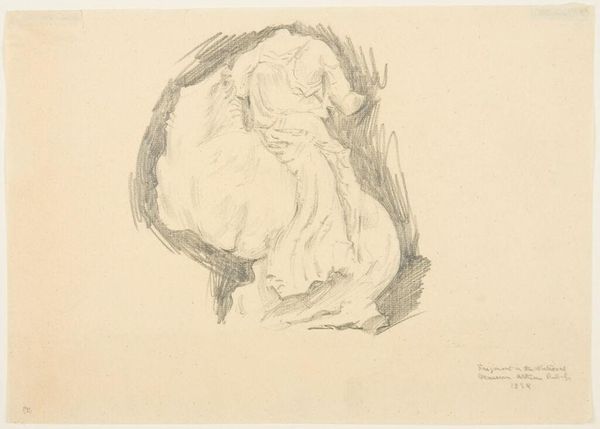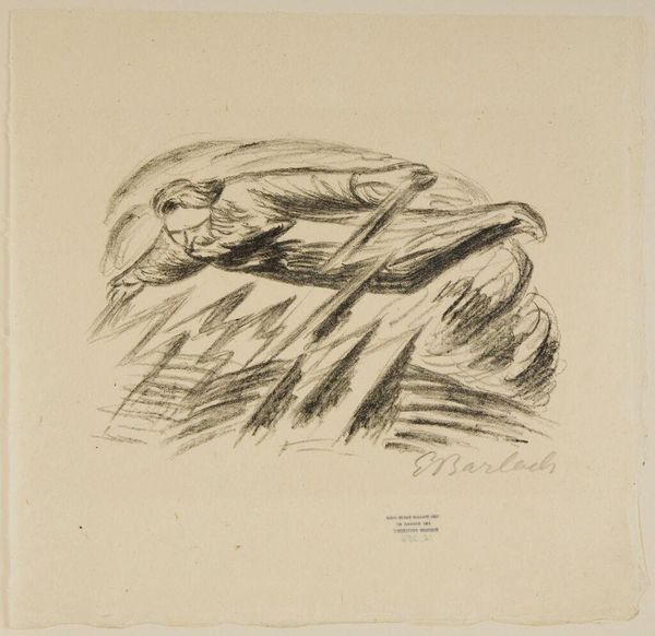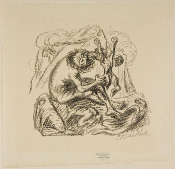 Editor: So this is Kokoschka's 1913 lithograph, "Pietà (Woman Bent over a Prostrate Figure)." The harsh, angular lines give it such a feeling of raw emotion and vulnerability, almost like a cry for help. What symbols or deeper meanings do you see in this work? Curator: The Pietà is itself a loaded symbol. Traditionally, it depicts Mary cradling the dead body of Jesus, embodying grief and compassion. But Kokoschka's version seems deliberately unmoored from specific religious doctrine. Do you notice how the figures are intertwined, almost indistinguishable? Editor: Yes, the merging of their forms is striking! Is he playing with the idea of shared suffering, blurring the lines between the mourner and the mourned? Curator: Precisely. It moves beyond a simple representation of grief and starts to explore the psychological impact of loss. The "prostrate figure" isn't necessarily dead; they could be overwhelmed, defeated. The woman's posture then becomes not just one of mourning, but also of protection and empathy. Editor: That makes sense. The ambiguity really amplifies the emotional impact. The image resonates in broader, more universally accessible ways. Curator: Consider the historical context too. Painted just before World War I, the image speaks to a premonition of widespread suffering, loss, and the shattering of traditional values. The woman, in this context, becomes a symbol of resilience in the face of impending doom. Editor: I never would have considered the historical backdrop to that degree. It definitely provides a fuller perspective! Curator: Ultimately, "Pietà (Woman Bent over a Prostrate Figure)" taps into deep-seated cultural anxieties and emotions, offering a glimpse into the human condition through potent symbolism and expressive form. Editor: It’s incredible how Kokoschka transforms such a familiar image into something so intensely personal and universal at the same time. I'll never look at the Pietà the same way again.