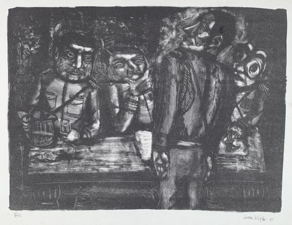 Editor: This is Murray Zimiles's "Execution of Resistance Fighters". It's a striking black and white print, and the stark imagery is incredibly unsettling. What do you see in this piece? Curator: It viscerally evokes the horrors of state violence. Think about the historical context: resistance movements, often marginalized groups fighting against oppressive regimes. How does Zimiles use stark contrasts and distorted figures to comment on power dynamics and dehumanization? Editor: The faceless executioners definitely convey a sense of impersonal cruelty. Curator: Exactly. It prompts us to question who is considered a "resistance fighter" versus a "terrorist," and how these labels are used to justify violence. Considering this work, how can art function as a form of resistance itself? Editor: I hadn't thought about it that way. It makes you wonder about art's role in challenging power. Curator: Precisely. And hopefully, inspires us to act.
