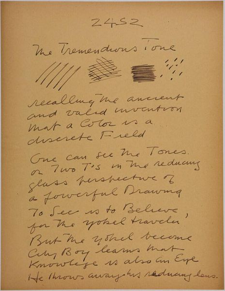 Curator: We are looking at Stuart Davis' "Art Theory Text with Diagrams" from the Harvard Art Museums. Editor: This feels like a peek into the artist's mind, almost like a lab notebook. The repetitive mark-making has a meditative quality. Curator: Davis explores a system here, dividing areas into colors within an "A-Dimension," then defining those areas with pigment color in a "B-Dimension." He's dissecting how we perceive color, breaking it down into components. Editor: It’s about the process of seeing, isn’t it? The act of mapping, of using tools to understand and then recreate visual experience. The use of pen and paper grounds the high-minded theory. Curator: Exactly. It’s his way of understanding form and space. A blueprint for his modernist aesthetic. Editor: A fascinating glimpse into the nuts and bolts of Davis's artistic machinery.