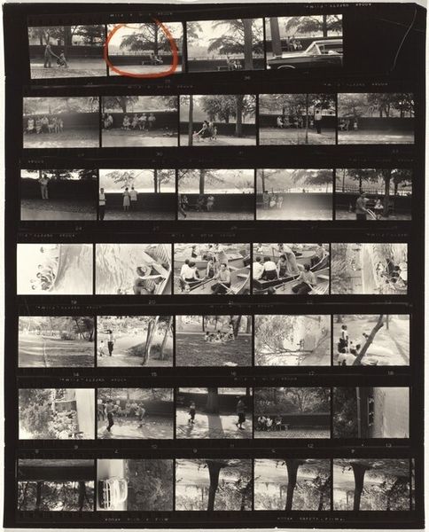 Robert Frank captured this contact sheet, titled "Family in Provincetown 6," in his signature black and white film. He printed all the images from the roll together on one sheet. This way of working makes me think about process as the artwork itself. The dark strips between the frames form a grid that anchors the moments and spaces that Frank shot. The subjects are varied: landscapes, windows, and children playing. The surface has marks and scratches from handling, adding to the raw feel of the piece. Look at frames 14 through 20—you'll see a young girl in a tree, sometimes upside down, a study in fleeting moments. Frank's style is a precursor to artists like Nan Goldin, who also documented raw, intimate moments. In art, it's not about perfection, but about capturing something real.