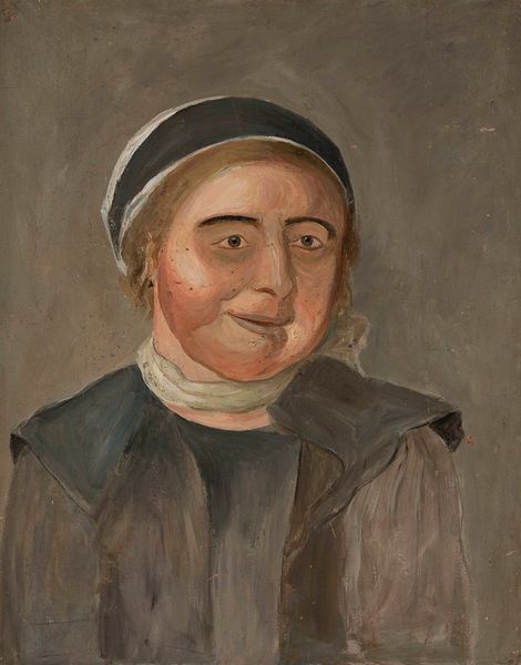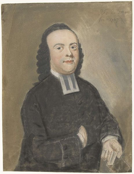Editor: So, this is Alfred Stevens' painting, "The Hon. and Rev. Samuel Best," housed at the Tate. The muted palette gives it a rather somber feel. What symbols jump out at you in this portrait? Curator: The clerical collar, stark white against the darker tones, speaks volumes. It's an emblem of faith, authority, and perhaps even sacrifice. Note how it draws your eye. What does that positioning suggest to you about the role of religion in society at the time? Editor: It’s almost like the collar is the focal point, more than his face even. It's a powerful symbol! Curator: Precisely. Symbols often work that way, distilling complex ideas into accessible visual language. Editor: I see that now. Thank you! Curator: My pleasure!
