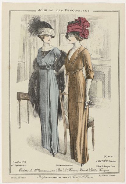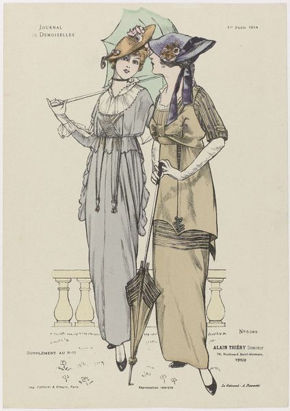This fashion plate was made in France and published in 1913 as a supplement to the Journal des Demoiselles. It shows two women modeling the latest Parisian styles. The Journal des Demoiselles was a popular magazine aimed at upper-class women, and it played a significant role in shaping their tastes and aspirations. The styles depicted in the image are characteristic of the early 20th century: the long, flowing lines, the emphasis on the waist, and the use of luxurious fabrics. Note the hats adorned with plumes - statements of wealth. These styles reflect the social and economic changes of the time, including the rise of consumer culture and the growing importance of fashion as a means of self-expression. The magazine was a tool used to reinforce social status and create expectations of beauty and dress. As art historians, we can consult primary sources like the magazine itself, as well as secondary sources like fashion history books and social histories of the period, to gain a deeper understanding of the fashion plate and its cultural significance.