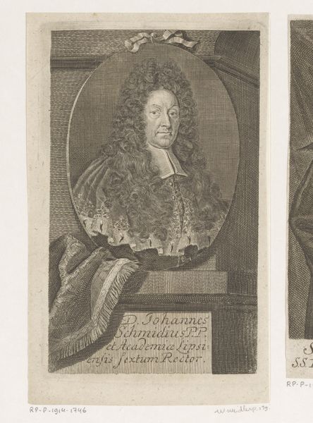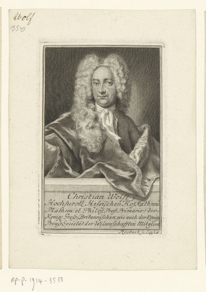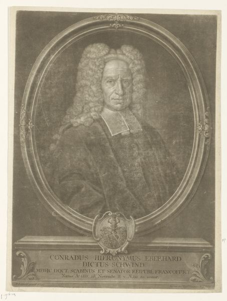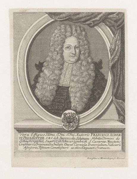 Curator: We’re looking at a baroque portrait from 1729 entitled *Portret van Johann Anton, Graf von Schaffgotsch*. The artist who rendered it is Martin Bernigeroth. It's an engraving, so printed, allowing wider distribution of the Count's likeness. Editor: My first impression is… theatrical. The wig practically *erupts* around his face. It seems like an exercise in excess, an almost comical display of status through hair and attire. Curator: It certainly captures the Count’s importance, but the wig, beyond being a marker of status, I read as symbolic, too. Hair has long represented vitality, virility, power. Here, it's amplified to an almost mythic scale, projecting the image of a powerful man. Editor: Right, but I think the print medium speaks volumes here. Bernigeroth, through meticulous labor and repetitive actions with engraving tools, transforms base metal into matrices of an image: in other words, he renders a high official as reproducible product, blurring the line between individual and image, original and commodity. How would this piece been sold, who worked in his shop? Curator: Interesting to think about Bernigeroth as entrepreneur with an audience. We see this iconography—the oval portrait, the imposing figure presented on a pedestal like ancient orators or heroes—as ways to signal prestige in that period. Note the Latin inscription—a declaration of the Count's titles and governance. It reinforces a carefully constructed persona. Editor: Absolutely. It's image-crafting on a grand scale. A material, etched expression of the man, as a marker for wealth and social position, made from readily reproducible material. You can mass-produce a Count through the printing press. I'm drawn to how that changes the way power works; instead of blood, he's paying to build an icon! Curator: That tension between unique individual and reproducible image adds layers to the print and reflects tensions of Baroque power structures. What might feel theatrical to the modern eye was integral to crafting and broadcasting a noble identity. Editor: Exactly, by recontextualizing and reappraising the materials in question—copper and paper here—I feel we unearth ways this artwork complicates our understandings of individual artistry in Baroque Era, exposing power in novel, reproducible formats.