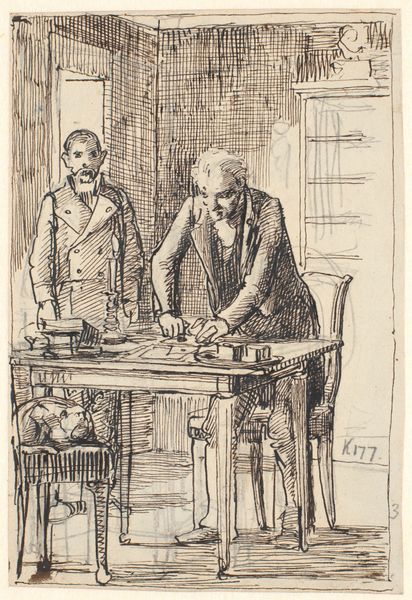 This is an undated print called Italienske Bønder, or Italian Farmers, by an anonymous artist. It depicts two men seated at a table playing cards, one smoking a pipe. The scene evokes questions about Italian identity and the rural working class. Who were these men? What were their lives like in the late 19th or early 20th century, given the clothing? Were they local to the area, or migrant workers? Card games often represent the negotiation of power dynamics and social interactions, especially within marginalized groups. This scene reflects a moment of leisure, but also hints at the socio-economic realities of rural life. The artist captures a personal moment with sensitivity. The anonymous nature of the artist and the lack of identifying characteristics in the figures invite viewers to project their own interpretations, engaging with broader themes of identity and belonging.