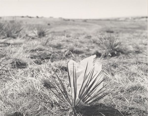 Curator: In Joan Fontcuberta’s 1984 photograph, "Costa Llobera Garden, Montjuic, Barcelona," we are presented with a striking landscape. What is your initial take on this black and white image? Editor: My first thought is how strangely melancholic it is. Those drooping plants, almost like figures bowed in grief. The monochrome palette definitely amplifies that somber mood, a stark contrast between the heavy plants and the blurred, industrial horizon. Curator: The choice to render this garden in monochrome certainly directs our reading, doesn't it? The play of light and shadow highlights the texture of the arid landscape, but I think there’s also a political element here. We're seeing this space, not as some postcard-perfect vista, but rather in a state of, dare I say, exhaustion, maybe even reflecting the political climate of the time. Editor: Exactly! Placing this image within its sociopolitical context is key. Post-Franco Spain was navigating significant transitions and, looking at these drooping plants against the backdrop of cranes and construction, there is a sense of a struggle between the organic and the imposed, between nature and industrial development. It raises questions about land use, about whose stories get told and whose are suppressed in these transformations. Curator: I think there’s also a subtle nod to traditional landscape photography being disrupted here, or being viewed through a lens of self-awareness. There’s a sort of defiance, it makes you consider not only the beauty of the scene, but also what beauty *isn’t* - what’s wilting away or fading out of view. Editor: That disruption you mention is significant. It resists the romantic ideal of landscape and instead confronts viewers with a garden that appears burdened, almost as if under the weight of external pressures. The textures pop, especially given the plants almost look alien in such a well documented landscape! It is really more than a snapshot, a call to awareness about the social realities underpinning the scenes we often idealize. Curator: The artist's keen awareness and our own assumptions, that all makes sense. What a powerful garden to capture the attention, making us ask all these questions about our role in constructing perceptions around an image. Editor: Exactly, seeing this piece with you made it so alive for me.
