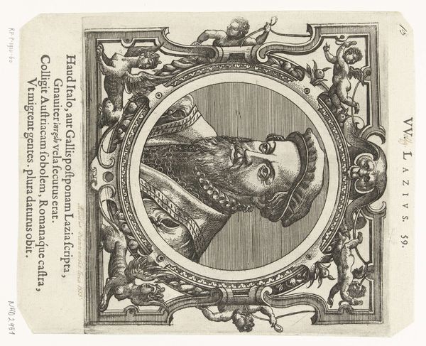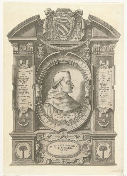 Editor: So, this is a Baroque engraving titled "Portret van Nicholas Bruyant" by Paulus Pontius, created sometime between 1638 and 1657. It's striking how the portrait is framed within this elaborate architectural structure. I’m curious, what visual elements stand out to you in this piece? Curator: Immediately, the formal composition grabs my attention. Notice the stark contrast in textures, the smooth portrait juxtaposed with the highly ornamented framework. This tension creates a visual push and pull. Consider the calculated use of line—etching defines the physiognomy of Bruyant and meticulously articulates the architectural setting. Do you observe how the circular medallion containing the portrait echoes the celestial globe above? Editor: Yes, I see what you mean. It almost seems like a deliberate attempt to connect Bruyant with the cosmos, reflecting his profession. But how significant are the textual elements woven into the structure? Curator: The text, serving as an integral part of the artwork, delivers information while also structuring the visual field. The lettering is formal, yet subordinate to the portrait and ornamental framework. A play of intellect and authority occurs here. The Latin inscription surrounding the portrait, "Per art ad astra, Sapiens Su," translates roughly to "Through art to the stars, know yourself." Consider the inscription acting as both label and pronouncement, a claim on identity itself. Editor: So the engraving presents not only a likeness, but also a structured assertion of Bruyant's intellectual prowess and status? Curator: Precisely. It is the formal arrangement that generates meaning, presenting the man as a scholar. How fascinating that the semiotic arrangement and philosophical intention of art can merge, wouldn’t you agree? Editor: Definitely. Looking at it now, the arrangement really underscores how intentional the piece is in crafting Bruyant's image. Curator: Indeed, a potent reminder that an artwork’s construction significantly shapes our perception.