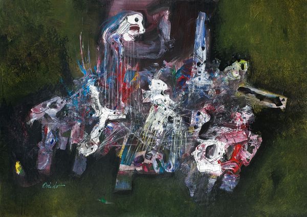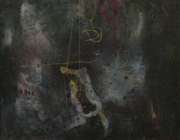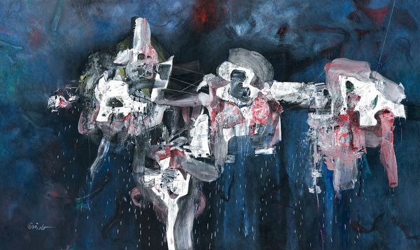 Curator: We’re now standing in front of Ramón Oviedo’s striking work, "FORMA HERIDA," created with oil paint, exemplifying Abstract Expressionism. Editor: Oh, my goodness. That raw, visceral feel—it hits you right in the gut. It's a wild dance of light and shadow; like a storm brewing in the soul. Is this painted on canvas or wood? You can tell from the intensity of color that its creation had some element of struggle involved. Curator: Indeed, it’s on canvas, and the visible texture suggests Oviedo worked the surface extensively, perhaps layering and scraping the paint. Think about the availability and affordability of paint itself at the time, and what choosing these shades might represent regarding class status, social values, and what resources an artist might rely on to find his paints. I read a very similar book from Princeton University where… Editor: Before you dig into it; is there something injured in its structure? Because the canvas looks quite wounded… This almost reminds me of deconstructing old things like ships with rusted metal or abandoned castles taken over by trees and foliage; it's chaos, yes, but one charged with so much history! You almost want to get lost and wander in. Curator: "Wounded Form" encapsulates the raw emotionality that fueled much Abstract Expressionist work. The painting technique seems to emphasize process and materiality, underscoring both creation and… potential deconstruction? Is the layering there as some visual analogy to what someone's mindstate is? Or does Oviedo simply start by making lines on blank canvases to later fill space from? There must be a story there. Editor: Exactly! What was Oviedo experiencing that inspired such passionate mark-making? Or perhaps is he exploring something about our shared, often fractured humanity? Perhaps what inspires this sense of injury is the very construction of a place from memory where a specific moment is revisited to be seen and deconstructed on repeat like therapy—it feels therapeutic but it's so raw. I wonder why. Curator: Right. Oviedo's work moves beyond formal composition. We see the residue of artistic labor embedded into each application and decision—layer upon layer of the materiality involved within a piece. This invites an engagement with art history, consumerism in art supply and labor. And ultimately makes you stop to wonder how an artwork’s meaning becomes negotiated across different positions over time and within cultural environments—because how an artist from then builds an art supply cache is quite different than someone from now! Editor: Precisely, because how can anyone resist a visceral journey through something that has to say a great deal—or say absolutely nothing, it's your decision. Art isn't simply the beauty created, it also is the mess in the background that nobody else notices other than yourself. But at the end, it helps give meaning to things bigger than me... which this canvas just successfully accomplished for now!