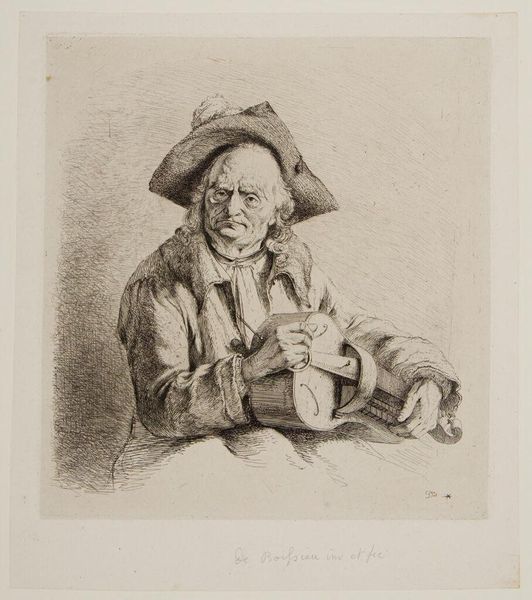 Curator: Jean Jacques de Boissieu's "Hurdy-Gurdy Player" captures a musician with striking detail. It's currently held in the Harvard Art Museums. Editor: The immediate effect is quite somber, wouldn't you agree? The crosshatching creates a wonderful study of wrinkles and textures, but also seems to age him. Curator: Indeed. The figure evokes the socio-economic realities of musicians during that era. The instrument, a symbol of folk music, positions him within specific class structures. Editor: Semiotically, the hat and clothing signal a departure from courtly fashion, a visual marker of his place within the social hierarchy. Curator: And the gaze, directed slightly downward, speaks volumes about the musician's position. Is he aware of his role, his stereotype? Editor: Perhaps. Considering the artist's formal technique, one could argue the downward gaze emphasizes the complex interplay of light and shadow across his face, adding depth to the two-dimensional image. Curator: An intriguing point! It’s through these combined lenses that we can better grasp the nuances woven into Boissieu's work. Editor: Agreed. A powerful demonstration of how technical skill merges with contextual awareness to enrich our understanding.