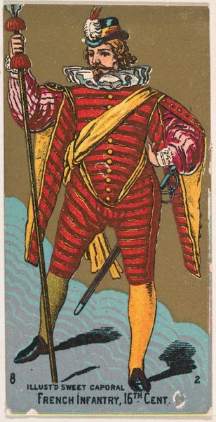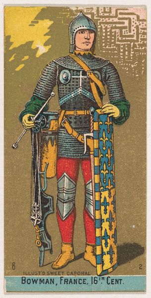 Editor: Here we have “Foot Soldier, France, 14th Century” from the Military Series, created around 1888 by the Kinney Tobacco Company. It’s a small print, seemingly designed for trade cards. It has a bit of an amusing, caricatured quality to it. How should we understand it? Curator: What strikes me immediately is the historical context of its creation. Consider, here you have an image seemingly intended to represent medieval France, but produced as an advertisement for cigarettes in the late 19th century. How do we reconcile this? Editor: Right. It feels like they're playing with history rather than depicting it faithfully. Curator: Precisely. These kinds of images functioned within a larger culture of popular imagery. Cigarette cards like these were incredibly common. They played a role in shaping public understanding, or perhaps, misunderstanding, of historical figures. Think about what narratives were being promoted and what might have been left out. Do you think accuracy was a primary concern? Editor: Probably not, more like constructing an appealing, digestible story… kind of like historical fan fiction, if that makes sense? I see it as part marketing, part fantasy. Curator: Exactly! The company exploits a romanticized, exoticized vision of the past to sell its product. It makes me question the intentions and messages behind the historical imagery we encounter even today. Editor: This really shifts my view of it. It’s more than just a quirky picture, it speaks to how powerful corporations are able to shape and influence historical perception for their own gain. Thank you. Curator: Indeed, viewing art through the lens of social and commercial history certainly gives us new avenues for understanding even the simplest seeming images.