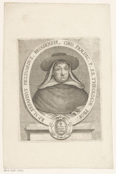 Curator: Here we have Martial Desbois's 1682 engraving, "Portret van Iordanus Iordani." Editor: Immediately, I'm struck by the rather austere stillness. The subject's gaze and the monochrome medium impart a contemplative, almost monastic air. Curator: Desbois renders Iordani within a detailed oval frame, encircled by text indicating his role as Professor of Logic and member of the Order of Preachers, set against a plain background which throws the engraving into sharp relief. The subtle gradations in tone really make you appreciate the baroque emphasis on the play of light. Editor: Absolutely, but beyond that skillful rendering, consider the socio-political context of portraiture in the late 17th century. The Church’s status was threatened by a burgeoning Enlightenment. Images like these had immense value. Portraits were statements of position, not mere decoration, particularly in scholarly circles. The presence of religious iconography reinforces his standing within that world. Curator: The choice of metal engraving lends itself to the minute precision and detail evident in the rendering of the drapery and facial features. The light appears to skim the surface creating varied patterns on his hood and mantle. It directs our eye meticulously. Editor: And let's note the composition itself. Encircling his portrait with his credentials reinforces his authority, making it more than just an aesthetic display. The symbolic gravity here is immense! He looks to me like an individual trying to solidify the Church. Curator: By using strict adherence to formal conventions in Desbois' technique and in his emphasis of composition we reveal how images can create and sustain specific values of erudition within society. Editor: True, but even more profoundly, the image itself became a small cog in a larger machine of the social and religious discourse of the time. Thank you, that was insightful. Curator: A useful exercise for emphasizing both detail and larger understanding!