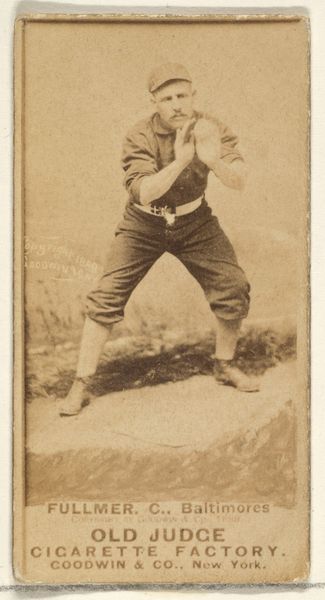 Curator: Here we have a sepia-toned albumen print titled "William Ashley 'Billy' Sunday, Center Field, Pittsburgh," produced circa 1888 by Goodwin & Company as part of the "Old Judge" series to advertise cigarettes. What are your initial impressions? Editor: My first thought is this photo encapsulates the ethos of its time. A lone figure, bathed in a nostalgic sepia tone, framed within the commerce of leisure and consumption. The figure seems caught mid-action, almost timeless in this still moment, however there's also an uncanny staged feeling that is really speaking to its history and origins. Curator: The subject’s gaze and posture point upwards to a sphere—the baseball, we assume. The shape resonates with archetypal symbolism; wholeness, potential, unity… but here, linked intrinsically with burgeoning capitalist endeavors, transforming that simple potential to explicit consumption. What happens to an athletic icon when their very image sells cigarettes? Editor: Precisely, the man in the image transforms into an advertisement. He becomes a symbol appropriated by corporate powers, revealing a cultural phenomenon where athletic prowess and endorsements blurred, obscuring the individual, morphing the image into one which serves profit over genuine sporting appreciation. He isn't just playing ball, he is propagating consumption. Curator: He's also propagating a cultural script—of idealized masculinity, of Americana, frozen for all time in this moment of almost Grecian dedication. He almost strikes me as a character on a frieze, or in a history painting of old. Editor: I agree. Looking closer, there's an undercurrent of privilege visible, despite the supposed democratic appeal of baseball. The cigarette advertisement itself would not appeal to certain sections of the public and reflects societal hierarchies of who had access and leisure for these pursuits at the time, therefore, his representation would reflect these inherent social positions. This card inadvertently reveals then, a carefully constructed narrative that quietly marginalizes entire swathes of society. Curator: That interplay of cultural narratives makes it a truly potent image, I feel. Even just at this small scale— the piece exists as part of a larger cultural symbolic vocabulary, doesn’t it? And the cigarette cards remind us of all that culture they participated in. Editor: Absolutely, and it brings with it complex legacies. A great visual summary that prompts so much introspection.
