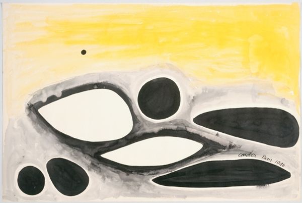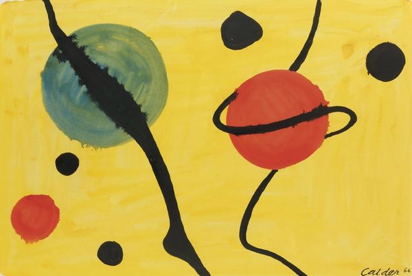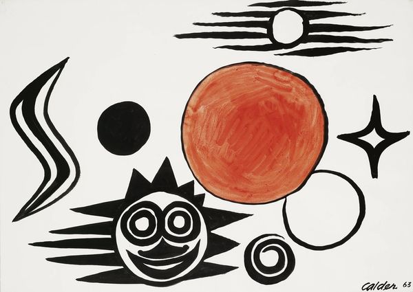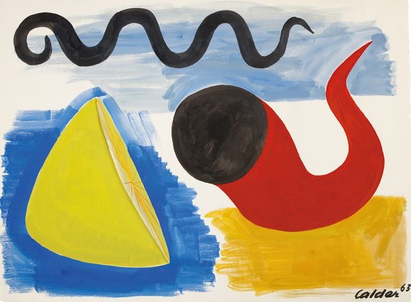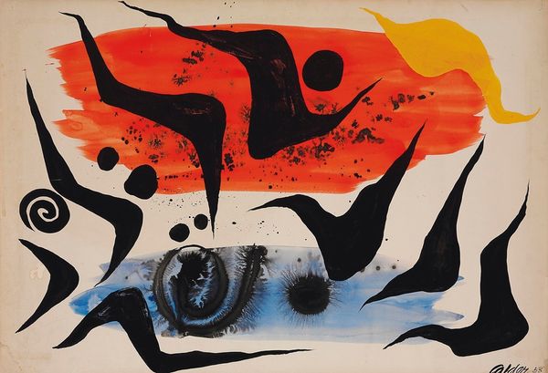 Curator: Looking at Alexander Calder’s “Black Boomerangs, Red Sun” from 1946, I am immediately struck by its elemental power. The red sun feels like a primal force. Editor: I see it too. Though with its thin watercolor washes on paper, there is a real economy of means at play. This feels lighter than one might expect, considering those hefty boomerang shapes. What was Calder working through at this time material wise? Curator: The title evokes themes of cosmic order, or perhaps disruption, reflected through its biomorphic shapes. Calder, even early on, was interested in how basic shapes influenced art. Think about his Circus. The black boomerangs – do you see them as potentially returning? Editor: Fascinating! Yes, there's a potentiality of motion there. And considering he created this piece in 1946, that makes the process itself quite powerful, as paper was incredibly limited and heavily regulated right after World War II. The colors might feel joyful on their face but they stand for rationing and making do, in some respect. Curator: That rationing almost lends the colors a further intensity, knowing the lack they arose from. It underscores that interplay between form and void and that search for fundamental harmony which feels universal. The blue is almost playful next to that aggressive Red sun. Editor: Absolutely. He wasn't able to rely on heavy impasto, to conjure something so evocative speaks to the ingenuity required when material options are limited. I keep coming back to that labor! It's far from carefree. Curator: Exactly. Even these simple forms resonate because they contain layers of struggle and potential – like seeds containing life. The boomerangs appear suspended, in this almost surreal, watery space. What might he have had in mind using geometric abstraction? Editor: Perhaps that speaks to the search of understanding postwar conditions through abstract language, like a universal sign. As far as it can move across borders to find peace? It's beautiful how what might seem simple reveals the deeper meanings behind Calder’s choices of media during wartime. Curator: Yes, indeed. It truly demonstrates how form can speak volumes, resonating long after its creation. The use of such minimal elements achieves a truly potent message. Editor: I concur; reflecting on its wartime context highlights both the limitations and possibilities inherent in materials.