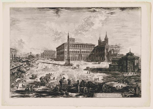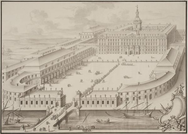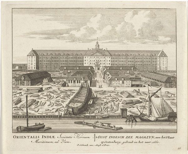 Curator: This print, created by Joseph Mulder in 1726, presents a detailed "View of the East India Naval Depot and the Shipyard on Oostenburg in Amsterdam." It’s a beautiful etching, currently held in the Rijksmuseum. Editor: My first impression is…organized chaos. There's an almost unbelievable amount of activity crammed into this image. It's incredibly busy, yet meticulously rendered. Curator: The Dutch Golden Age was fueled, in no small part, by the activities depicted here. Mulder's work provides insight into the labor practices of the time and the scale of the Dutch East India Company's operations. We can almost trace the routes of resource extraction through its architecture. Editor: It's like peering into the engine room of global trade! You can almost hear the hammers and shouts. I keep getting drawn back to the building itself. It looms. A total power statement rendered in brick and mortar. Does anyone have any thoughts on its relationship with labor at this time? Curator: Absolutely. The vastness of the building dwarfs the workers, creating a visual hierarchy. Furthermore, while the Dutch Golden Age brought prosperity to some, it was built on exploitation and colonialism, including forced labor abroad. So the print isn't merely a neutral depiction of shipbuilding; it's a testament to systems of power and extraction that operated, quite literally, on an industrial scale. Editor: Exactly. It reminds me of Piranesi, the way the structure embodies and seems to mock human efforts. I'm stuck imagining what each person's day consisted of. Do we know any more about the individuals? Curator: Archival records allow us to reconstruct, in part, the identities and working conditions of people present in the work, even if they're reduced to generic forms in the image itself. But doing so compels us to look beyond the "picturesque" scene toward a complex reality. Editor: It's a chilling insight, a vital layer to appreciate beyond the historical quaintness. I am struck now by how this image functions as both a record of burgeoning global trade and a silent indictment of its cost. Thank you for offering the relevant perspective, there is an undeniable grandeur to the print but contextualizing the ethical framework helps to view it properly. Curator: Indeed. Engaging with art like this compels us to acknowledge that the aesthetic and the political are often inextricably linked. I, in turn, appreciate your attention to lived human experience and emotion—reminding us that archives aren't just lists of names, they are repositories of lost voices and bodies.