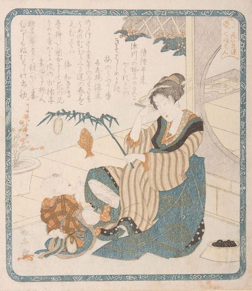 This print, "A Woman as Ebisu," was made by Katsukawa Shuntei around 1800, using woodblock printing. The production of these prints was highly industrialized, involving teams of designers, block cutters, and printers. Each contributed specialized skills to create the final image. Looking closely, you can see how the grain of the woodblock influences the appearance of the print, particularly in the subtle textures of the woman’s kimono and the child’s robe. The lines are crisp and precise, reflecting the skill of the block cutter. Areas of flat color emphasize the graphic quality inherent in the process. Woodblock printing allowed for mass production, and these prints were relatively affordable. They offered a glimpse into the lives of courtesans and actors for a broad public. The print’s creation reflects the economic systems of the time, where skilled labor and mass production met the demand for affordable art. It reminds us that even seemingly simple images are the result of complex social and economic relationships, blurring the lines between fine art and commercial craft.