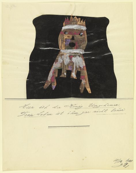 Editor: We're looking at John Elsas’ 17107 (\u201eHier ist zu sehen die Zeit der Not \u2026\u201c) from 1932, a drawing incorporating collage and gouache. There's a striking, almost childlike, figure constructed from layered shapes. What jumps out at me is how the artist uses very basic geometric forms to represent something complex. What do you see in this piece? Curator: The formal elements immediately draw my attention. Note the stark contrast between the saturated purple and the muted background. The composition relies on a central, almost symmetrical, figure, but that symmetry is deliberately disrupted. Observe how the color choices create dissonance, avoiding harmonious blending. Why do you think the artist chose this specific, limited color palette? Editor: I guess to amplify that sense of unease? The title, referencing "the time of need," combined with the discordant colors, maybe creates a feeling of anxiety? I see this imbalance repeated in the texture of the piece. Curator: Precisely. Look at the varying textures, from the flat planes of color to the almost frantic application of white gouache. There's a push and pull between order and chaos, flatness and depth. Does this contrast reveal anything about its emotional weight? Editor: Absolutely! The artist creates an awkward depth, yet seems to reject any perspective. It feels unfinished and somehow raw and emotional. Curator: The materials themselves contribute to this sense of immediacy, a feeling of the work being quickly assembled, a snapshot of a raw nerve. By reducing form to this almost primitive level, the artist underscores the desperation embedded within the image. Editor: It is fascinating how limiting your choices accentuates emotional intensity. I’ll definitely remember how Elsas created it using just compositional shapes and colors.