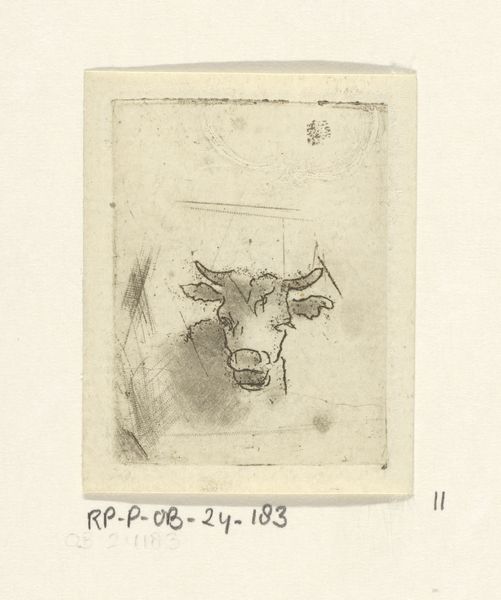 Editor: This is "Koeienkop," or "Cow's Head," an etching by Jan van Noort, created sometime between 1766 and 1837. The sketchy lines give it an unfinished quality. What strikes you most about its composition? Curator: The work's strength lies in its deliberate incompleteness, an intentional disruption of the classical illusionism. Note how the foregrounded cow's head is rendered with relatively greater detail, commanding our focus, while the rest of the plane dissolves into near abstraction. Van Noort presents a visual puzzle, challenging the viewer's expectations of mimetic representation. What sense do you make of this incompleteness? Editor: It feels modern, almost like the artist is emphasizing the *process* of creating an image, not just the final product. The cow feels secondary to the textures of lines. Curator: Precisely. It can be argued that by fragmenting the visual field, Van Noort draws attention to the materiality of the etching process itself. The linear quality emphasizes flatness. Editor: So the content of the etching becomes less important than the technique. The picture of a cow just provides an opportunity for the artist to demonstrate his skills. I didn't expect to be challenged so profoundly by a simple depiction of a cow! Curator: Exactly. The animal is a vehicle to show a new aesthetic terrain that invites speculation and reflection. What may have seemed a mundane depiction is actually charged with radical vision.