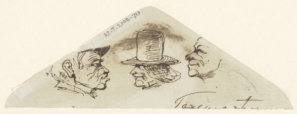 Johannes Tavenraat created this study of heads on paper using pen and ink sometime in the 19th century. The artist’s chosen material—paper—is fragile, and its transparency allows us to see the traces of the artist's hand as he sketched these heads. Tavenraat focused on the faces and head coverings, capturing expressions and details with confident strokes. The ink, applied with a fine-tipped pen, allowed for precision in linework, varying from delicate hatching to bold outlines, giving depth and form to the characters. As a study, this drawing is of particular interest because it shows the labor involved in the production of a finished artwork. We can appreciate the skill and practice necessary to achieve such mastery over the medium, emphasizing the value of traditional techniques in artmaking, challenging the perception of drawing as merely preparatory.