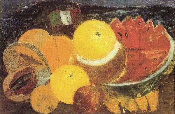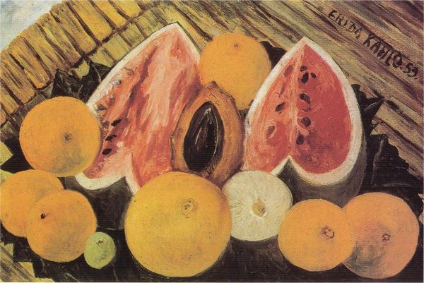 Editor: This painting, Still Life with Parrot and Flag, is by Frida Kahlo and is dated 1954. It's an oil on board, and it's quite small. I'm struck by the richness of the colors and the textures of all these fruits. What do you see in this piece? Curator: What I observe is a careful arrangement of forms and surfaces. The artist employs a palette of earthy and vibrant tones, meticulously rendering the distinct textures of each fruit—the bumpy skin of the pineapple, the smooth peel of the oranges, and the segmented flesh of the pomegranate. The composition itself is tightly packed, creating a sense of abundance. Notice how the light falls, highlighting the rounded shapes and the subtle variations in color. The flag, a stark graphic element, introduces a conceptual layer that disrupts the purely visual harmony. Editor: That's fascinating. I hadn't considered the interplay between the organic forms and the flag. It really makes you think. Curator: Indeed. The juxtaposition prompts an inquiry into the symbolic resonances of these elements. We could explore that further.