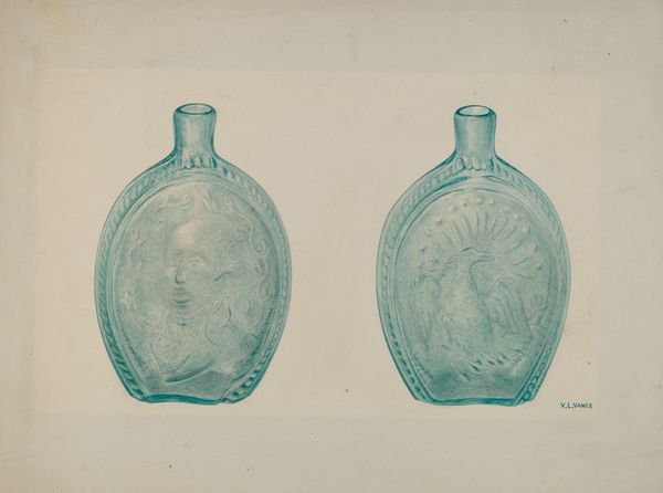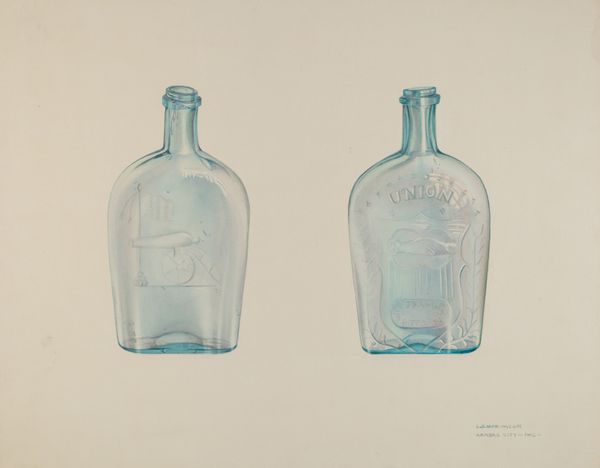Editor: Here we have Loraine Makimson’s "Green Whiskey Bottle" from around 1941, delicately rendered in watercolor. There's almost a ghostly quality to the translucence of the bottles, like a memory. What can you tell me about this piece? Curator: This artwork offers a glimpse into the evolving relationship between industry, consumerism, and art during the mid-20th century. Notice how the choice of subject – a mass-produced liquor bottle – elevates a common, everyday object. How do you think this reflects societal attitudes toward alcohol and consumer goods at the time? Editor: I suppose alcohol, especially after Prohibition, became a symbol of both celebration and accessible luxury. Maybe she's hinting at how industrial design was becoming a visual language of its own? Curator: Exactly! And consider the institutional context: art competitions during this period often featured works that promoted American industry and design. What effect do you think this could have on her art? Editor: So, artists might feel pressured to celebrate capitalist objects? That’s thought-provoking. Curator: The watercolor rendering softens the sharp edges of industrial design. Does that softening make the bottles less 'threatening'? Editor: It makes them much more approachable, less imposing than a photograph, more familiar. It shows the way an average person may see and consider alcohol and the objects used to contain it. Curator: Precisely! It offers a commentary not just on the object itself but on its place within American culture and the narratives we create around everyday items. The history is fascinating. Editor: I agree. I'm viewing it so differently now, looking through this socio-economic and cultural lens. Thanks!