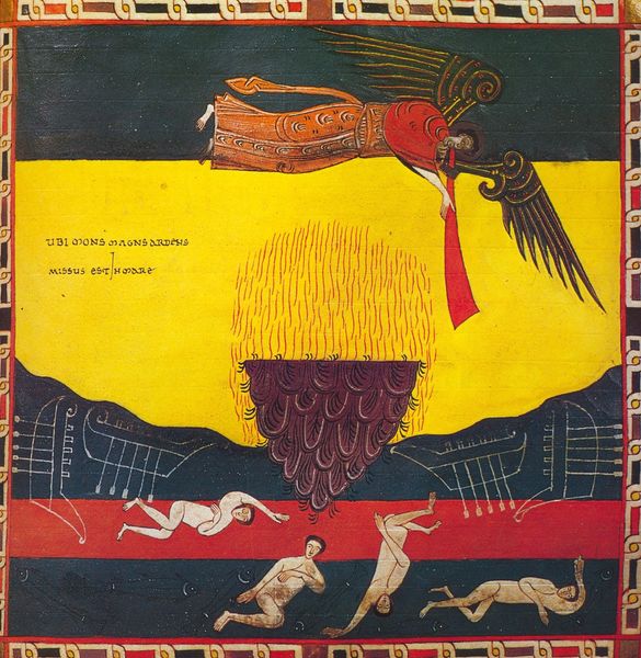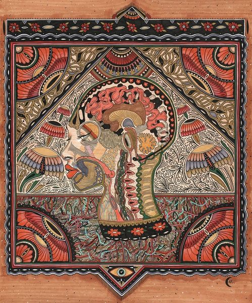 Editor: Kazimir Malevich's "Oak and Dryads," painted in 1908 with acrylic paint, is striking. The figures seem to blend into the landscape, giving it an otherworldly feel. What are your initial thoughts on this piece, seen through a formalist lens? Curator: Considering "Oak and Dryads" through a formalist approach, one is immediately drawn to the composition. Observe how Malevich employs a centralized structure with the oak tree serving as a dominant vertical axis. How does this central form affect the surrounding shapes? Editor: Well, it definitely commands attention. The red of the tree really pops, but it also makes the dryads, these nymph-like figures around it, feel a bit like they're caught in its gravity, or maybe radiating from it. Curator: Precisely. Notice the texture created by what appears to be a pointillist technique in the background and the contrasting smooth surfaces of the figures. Semiotically, red often denotes vitality, but here, juxtaposed against the stylized figures, what implications arise concerning nature versus the idealized human form? Editor: I see what you mean. It's like the intensity of nature is almost overwhelming these figures, even though they're supposed to be part of it. Does that disconnect point to a larger idea? Curator: Perhaps. Let us consider the application of color; observe how Malevich uses a limited palette of earth tones, punctuated by vibrant reds and yellows. This selective palette serves to flatten the picture plane, negating deep perspective and emphasizing the artwork’s surface quality. How does this flattening affect your interpretation of the mythical narrative presented? Editor: That flattening adds to that otherworldly feel I noticed. It detaches it from any sense of reality, making the myth more symbolic. I appreciate seeing how those elements contribute to its overall effect. Curator: Indeed. By attending closely to these formal elements, we begin to unpack the complexities of "Oak and Dryads," enriching our aesthetic experience.