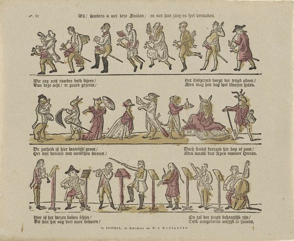 Editor: This pen and ink drawing, "Afbeeldsel der jongheid," dating from 1828 to 1913, presents a series of vignettes depicting scenes of childhood. The linear quality almost makes it read like a comic strip. What strikes me most is how formal and posed the children seem. What elements stand out to you? Curator: Indeed, the composition reveals a rigorous structure. The artist segments the picture plane into a grid, each containing a miniature scene. Note how the figures are uniformly lit, emphasizing their outlines and internal details equally. The minimal shading serves primarily to define form rather than create depth or atmosphere. Editor: So the artist is really prioritizing clarity and definition above all else? Curator: Precisely. Focus on the consistent application of line weight and the repetition of certain compositional elements, like the use of horizontal base lines for each scene. Ask yourself what that regularity achieves? It gives the scenes equal weight. There is very little variation. Editor: I see that. Even the handwritten text is quite uniform, and appears below each scene. Is this artist making a statement about childhood, perhaps standardizing it somehow? Curator: The evenness extends to the actions, observe: music, pets, riding toys, are represented, none preferred over another. Consider also how each little genre painting contains everything that is necessary. The composition feels very controlled, leaving little to chance. This creates a sense of order and containment, reinforcing that structure, perhaps? Editor: I hadn’t considered the implied messages of containment, but now I see how the artist uses each visual component to emphasize the overall structure. Thanks. Curator: A fascinating example of formalism and order, wouldn’t you agree?