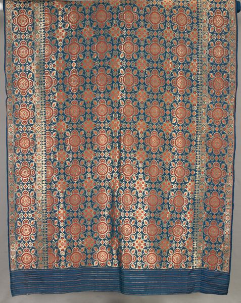Curator: Looking at this extraordinary piece, we see a woven wool shawl, dating from the late 19th century. It comes to us from Clabburn, Sons and Crisp. Editor: What immediately strikes me is its warmth. Not just in material but the colour palette – these sunset hues feel so inviting, yet the pattern itself seems quite intense and formal. Curator: That's interesting. Its regularity is part of what defines the object. Paisley patterns dominate; in this era, they became closely associated with the Arts and Crafts movement. The textile manufacturing trade tried to achieve ever more sophisticated decorative styles. Editor: The paisley motif itself has such an incredible history, moving across cultures for centuries. It appears in ancient Persia, representing the tree of life and often standing for fertility. To me, the repetition is not only decorative, but deeply evocative, conjuring cycles and continuity. Curator: Indeed. By the 19th century, these shawls had become hugely fashionable status symbols in Europe, partly spurred by their association with the exotic and Eastern. The Industrial Revolution mechanized production to keep up with the rising demand from wealthy clientele. Editor: Considering this mass production, do you see the makers retaining any individual creativity or symbolic intentionality? Curator: I believe so. The dense arrangement of the paisley, mixed with smaller geometric floral elements, speak to the hand-craft aesthetic which valued intricacy as a demonstration of artisanal skill and individual engagement in every unique pattern. Editor: And the fringe is fantastic. Little bursts of color in neat cadence! It gives an impression of the rhythm found in music or dance. All in all, an engaging example of how organic forms combine with calculated design, creating a feast for the eyes but a comfort for the soul. Curator: Definitely, reflecting on this wool textile provides insights on the industrial influences combined with a craft based intention of this moment in social history. Editor: Absolutely, and examining this item through the lenses of art history as well as a fascination with enduring symbols reminds us of art’s significance beyond pure aesthetics.